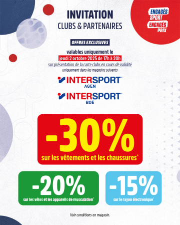 Nous sommes ravis de vous inviter à la soirée spéciale Clubs, organisée par INTERSPORT Agen et INTERSPORT Boé, partenaires de votre club ! Venez profiter d'offres exclusives* réservées uniquement aux licenciés, le jeudi 2 octobre 2025, de 17h à 20h. 🕔